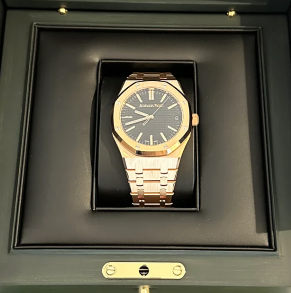 Das 41 mm große Gehäuse aus 18 Karat Roségold ist aufwendig satiniert und poliert – ein Spiel aus Licht und Struktur, das der legendären Royal Oak ihre unverwechselbare Tiefe verleiht. Die markante achteckige Lünette mit sichtbaren Schrauben signalisiert auf den ersten Blick: Hier trifft Designgeschichte auf Uhrmacherkunst.