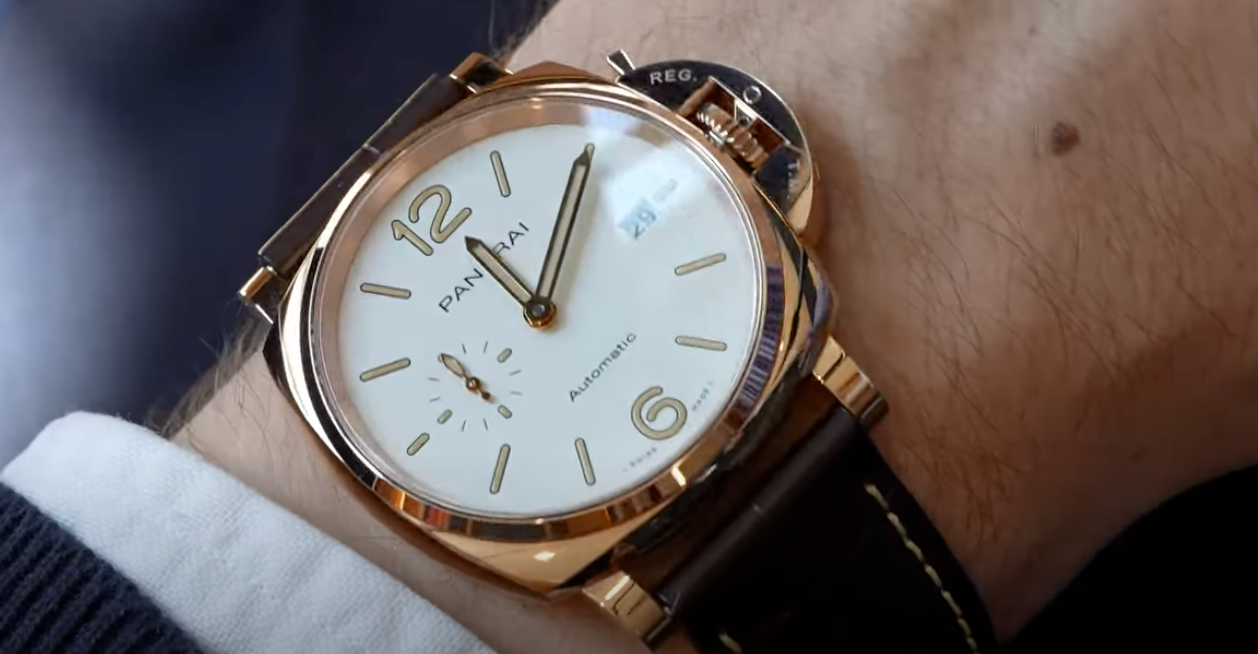 Das 42 mm große Roségoldgehäuse wirkt kraftvoll und zugleich elegant – mit typischer Kronenschutzbrücke, die Panerai zum ikonischen Wiedererkennungsmerkmal gemacht hat. Trotz des edlen Goldglanzes bleibt die Uhr dezent – ein Understatement für Kenner.