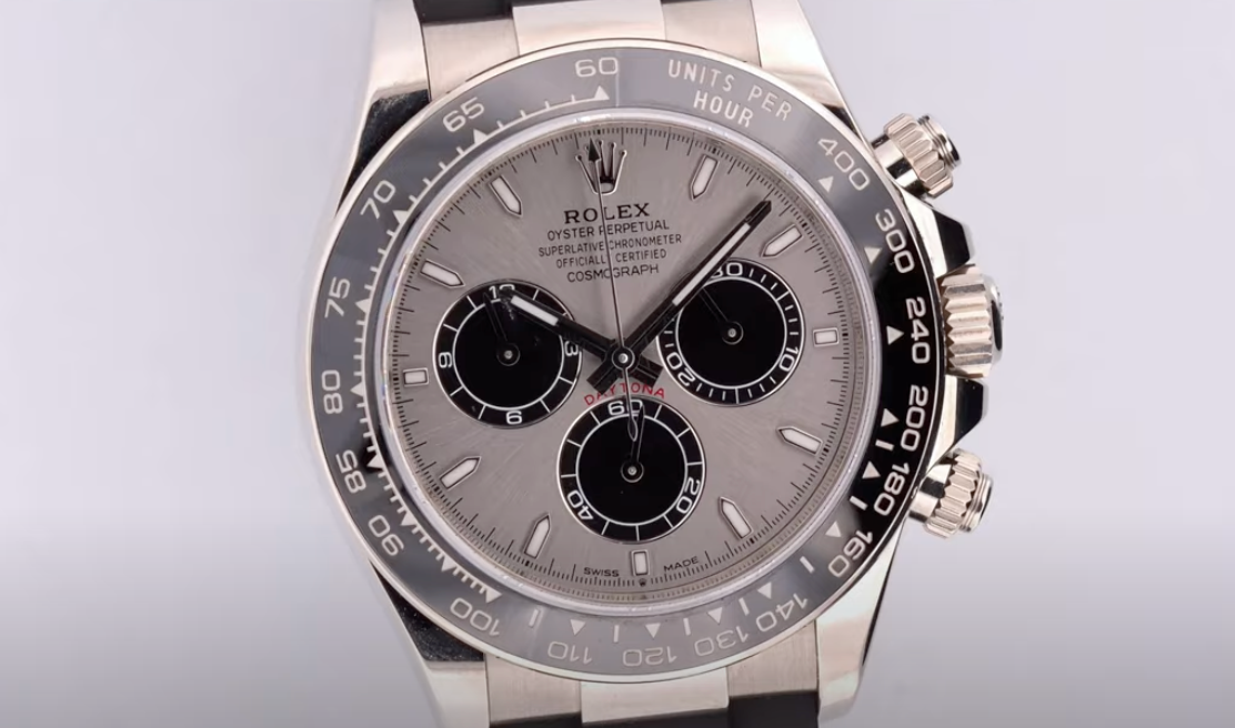 Das massive Weißgoldgehäuse verleiht der Uhr eine edle Präsenz, während die mattschwarze Cerachrom-Lünette mit Tachymeterskala nicht nur optisch besticht, sondern auch funktional überzeugt – insbesondere für Enthusiasten des Rennsports.