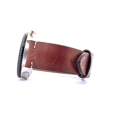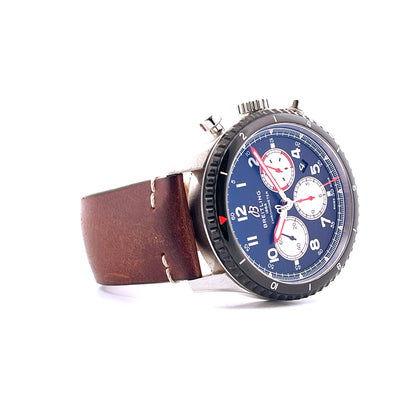 Referenz: AB01194A1B1X1. Die Aviator 8 B01 Chronograph 43 Mosquito von Breitling ist ein herausragendes Beispiel für luxuriöse Uhrmacherkunst, das sowohl Technik als auch Ästhetik in perfekter Harmonie vereint. Mit ihrem tiefschwarzen Zifferblatt, das von klaren, weißen arabischen Ziffern umrahmt wird, strahlt diese Uhr eine unverwechselbare Eleganz aus. Die drei Hilfszifferblätter, die mit leuchtend roten Zeigern ausgestattet sind, verleihen der Uhr eine sportliche Note und erinnern an die markanten Details der De Havilland Mosquito, einem der schnellsten Flugzeuge des Zweiten Weltkriegs.Das Gehäuse aus hochwertigem Edelstahl ist mit einer DLC-Beschichtung versehen, die nicht nur für eine beeindruckende Langlebigkeit sorgt, sondern auch einen modernen, technischen Look verleiht. Die gezackte Lünette und der geriffelte Gehäuseboden betonen die Präzision und Robustheit, die für einen Chronographen dieser Klasse unerlässlich sind. Das braune Lederarmband mit seinen eleganten weißen Nähten bietet nicht nur hohen Tragekomfort, sondern ergänzt auch das Gesamtbild der Uhr auf stilvolle Weise.Angetrieben von dem in-house Breitling Manufacture Caliber 01, bietet der Aviator 8 B01 Chronograph 43 Mosquito eine unvergleichliche Präzision und Zuverlässigkeit. Diese Uhr ist nicht nur ein Zeitmesser, sondern ein Symbol für Stil und Qualität, das die Herzen von Uhrenliebhabern und Luftfahrtenthusiasten gleichermaßen höher schlagen lässt. Sie ist eine Hommage an die De Havilland Mosquito, das "Wooden Wonder", und verkörpert die Geschwindigkeit und Eleganz, die dieses historische Flugzeug auszeichnete.Mit der Aviator 8 B01 Chronograph 43 Mosquito setzen Sie ein Zeichen für Exklusivität und Stil. Diese Uhr ist mehr als nur ein Accessoire; sie ist ein Ausdruck Ihrer Persönlichkeit und Ihres Geschmacks. Lassen Sie sich von der Faszination der Luftfahrt und der zeitlosen Eleganz dieser Uhr inspirieren und machen Sie sie zu einem unverzichtbaren Teil Ihrer Sammlung.