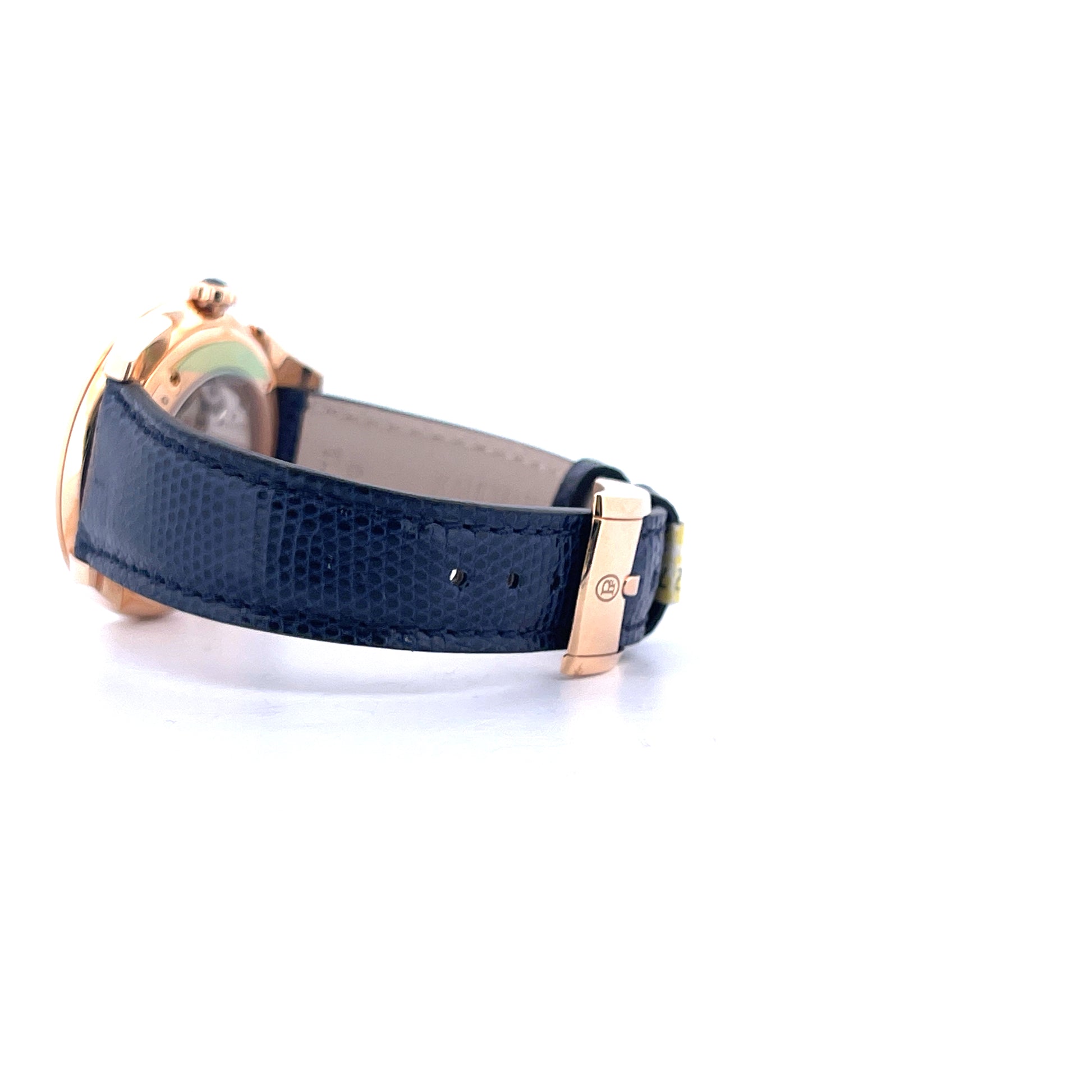 Die Parmigiani Fleurier Tonda Metropolitaine, Referenz: PFC800-1510320-HA2138, ist ein wahres Juwel der Uhrmacherkunst, das mit seiner unvergleichlichen Eleganz und seinem luxuriösen Design besticht. Diese Uhr ist nicht nur ein Zeitmesser, sondern ein Ausdruck von Stil und Raffinesse, der die Herzen von Uhrenliebhabern höher schlagen lässt. Das runde Gehäuse, umrahmt von einer funkelnden Diamantlünette, verleiht der Uhr eine Aura von Exklusivität und Glamour.Das dunkelblaue Zifferblatt mit seinem faszinierenden Glitzereffekt zieht alle Blicke auf sich. Die goldenen arabischen Ziffern bei 12, 3, 6 und 9 Uhr sowie die feinen goldenen Indizes verleihen der Uhr eine harmonische und ausgewogene Ästhetik. Die goldenen Zeiger gleiten präzise über das Zifferblatt und unterstreichen die technische Perfektion, die in jedem Detail der Tonda Metropolitaine steckt. Ein kleines Hilfszifferblatt bei der 6-Uhr-Position integriert die geschwungene Datumsanzeige auf elegante Weise und erweitert die Funktionalität der Uhr.Das dunkelblaue Lederarmband mit seiner strukturierten Oberfläche ergänzt das Design perfekt und bietet einen hohen Tragekomfort. Die Verwendung von edlen Materialien und die sorgfältige Verarbeitung machen die Parmigiani Fleurier Tonda Metropolitaine zu einem zeitlosen Begleiter, der sowohl im Alltag als auch zu besonderen Anlässen überzeugt.Die Tonda Metropolitaine ist ein Meisterwerk der Uhrmacherkunst, das modernen Stil und technische Raffinesse vereint. Die Mondphase bei 12 Uhr und die kunstvollen Perlmutteinlagen im Spitzenstil auf dem Zifferblatt sind Ausdruck der Liebe zum Detail und der Hingabe an die Kunst der Zifferblattherstellung.Diese Uhr ist ein Statement für Stil und Qualität, das anspruchsvolle Kunden und Uhrenliebhaber gleichermaßen inspiriert. Die Parmigiani Fleurier Tonda Metropolitaine ist mehr als ein Zeitmesser – sie ist ein Ausdruck von Persönlichkeit und ein Zeichen für exzellenten Geschmack. Lassen Sie sich von der zeitlosen Eleganz und der modernen Ästhetik dieser außergewöhnlichen Uhr verzaubern und erleben Sie die Faszination der Uhrmacherkunst in ihrer schönsten Form.
