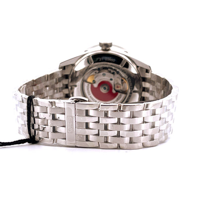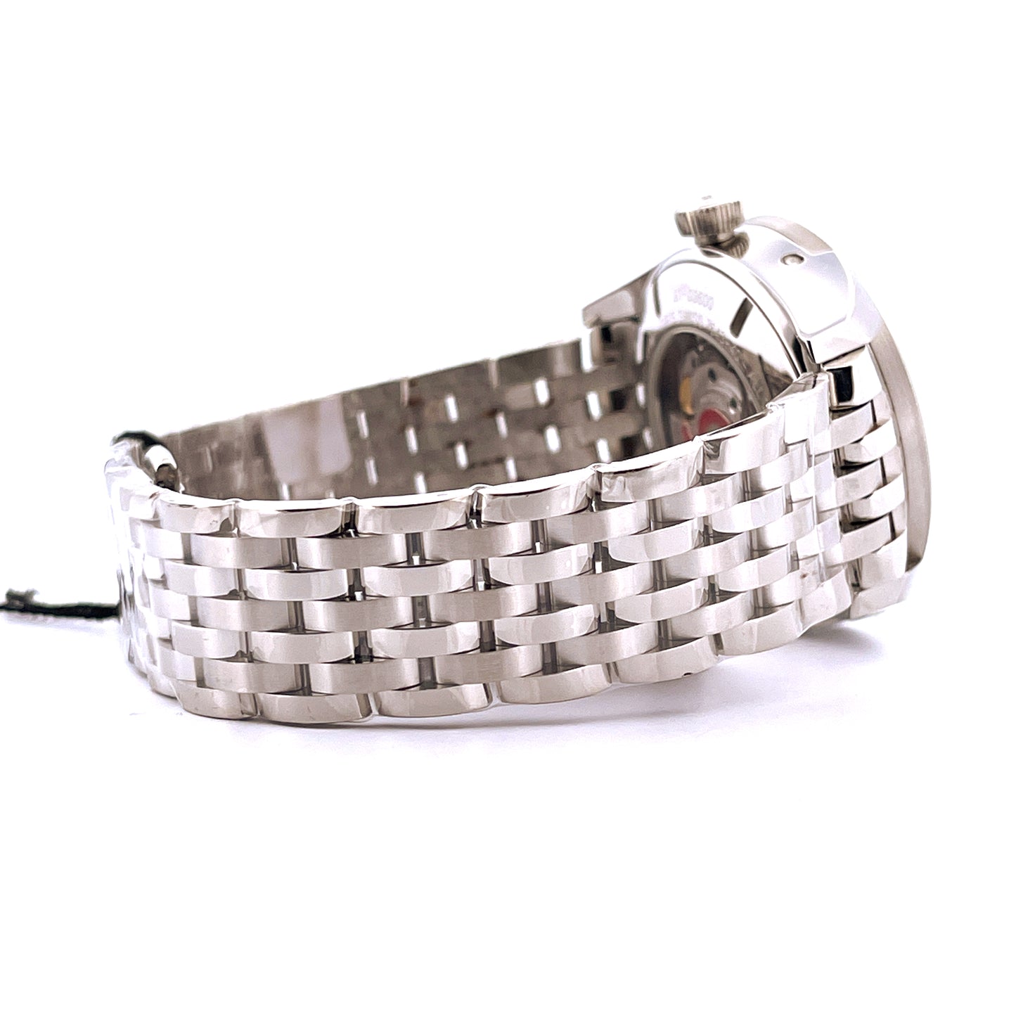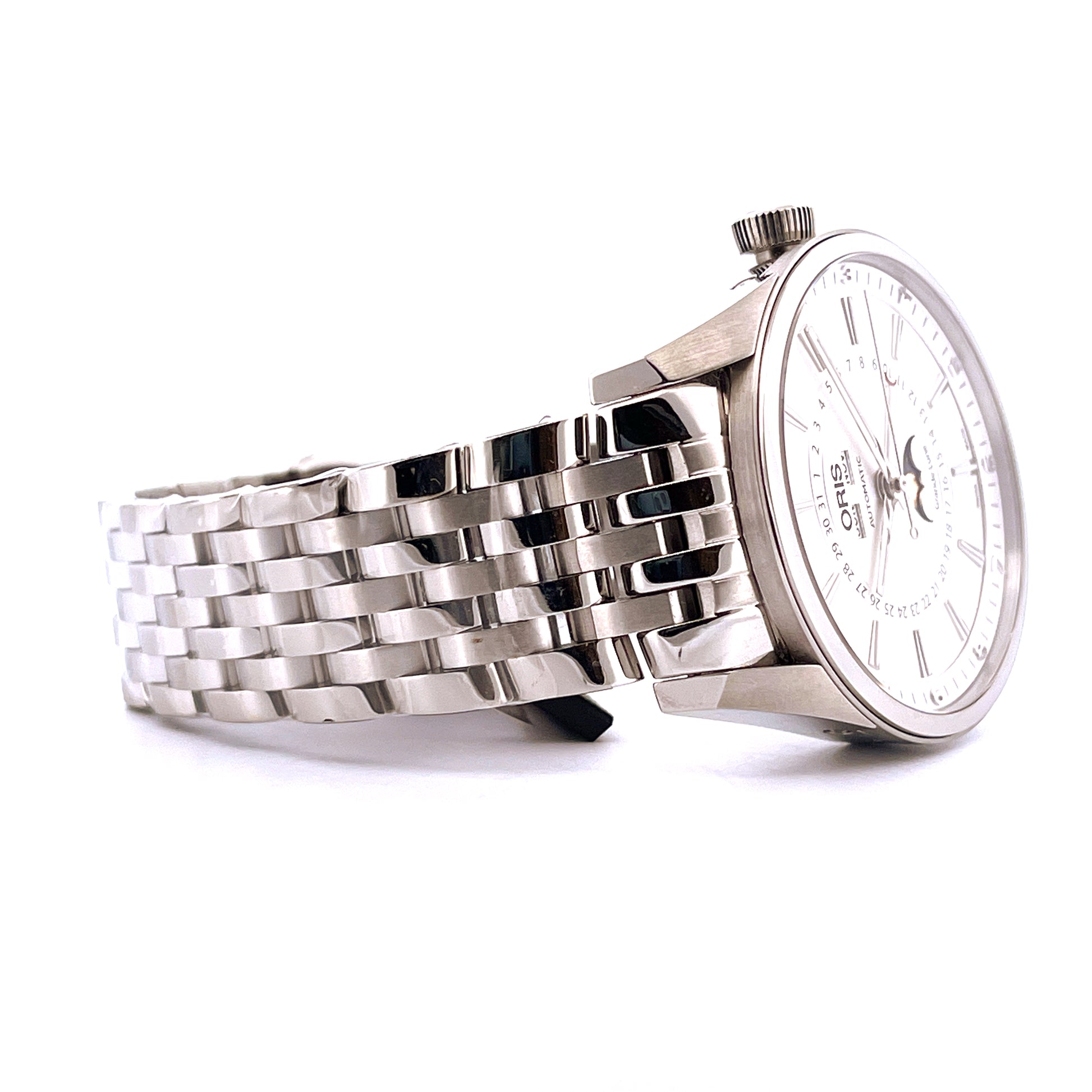 Die Oris Artix Complication, Referenz 01 915 7643 4051-07 5 21 81FC ist eine Luxusuhr, die mit ihrer zeitlosen Eleganz und technischen Raffinesse begeistert. Sie wurde für Kenner und Liebhaber von hochwertiger Uhrmacherkunst entwickelt, die das Besondere schätzen. Ihr Gehäuse aus Edelstahl mit einer polierten Oberfläche verleiht der Uhr eine edle Ausstrahlung, die durch das silberfarbene Zifferblatt mit applizierten schwarzen Stundenindizes und einer feinen Minuterie am Rand perfekt ergänzt wird.Im Inneren dieser Uhr arbeitet das automatische Uhrwerk Oris 915, das mit einer Tag-, Datums- und Mondphasenanzeige ausgestattet ist. Diese Komplikationen zeugen von der meisterhaften Handwerkskunst von Oris und bieten zugleich praktische Funktionen für den modernen Alltag. Die zentrale Stunden-, Minuten- und Sekundenanzeige wird durch schlanke, schwarze Zeiger dargestellt, die optimal mit den Indizes harmonieren und eine klare Ablesbarkeit gewährleisten.Das silberfarbene Gliederarmband, das polierte und gebürstete Elemente kombiniert, verleiht der Uhr eine moderne und dennoch klassische Optik. Ein besonderes Highlight ist die Mondphasenanzeige bei der 6-Uhr-Position, die die Verbindung von traditioneller Uhrmacherkunst mit zeitgenössischem Design eindrucksvoll unterstreicht.Die Oris Artix Complication ist mehr als nur ein Zeitmesser – sie ist ein Ausdruck von Stil, Qualität und Individualität. Mit ihrer perfekten Balance zwischen Luxus und Funktionalität ist sie sowohl für den Alltag als auch für besondere Anlässe die ideale Wahl. Diese Uhr verkörpert zeitlose Eleganz und technische Exzellenz und ist ein Must-have für jeden, der Wert auf präzise Uhrmacherkunst legt.