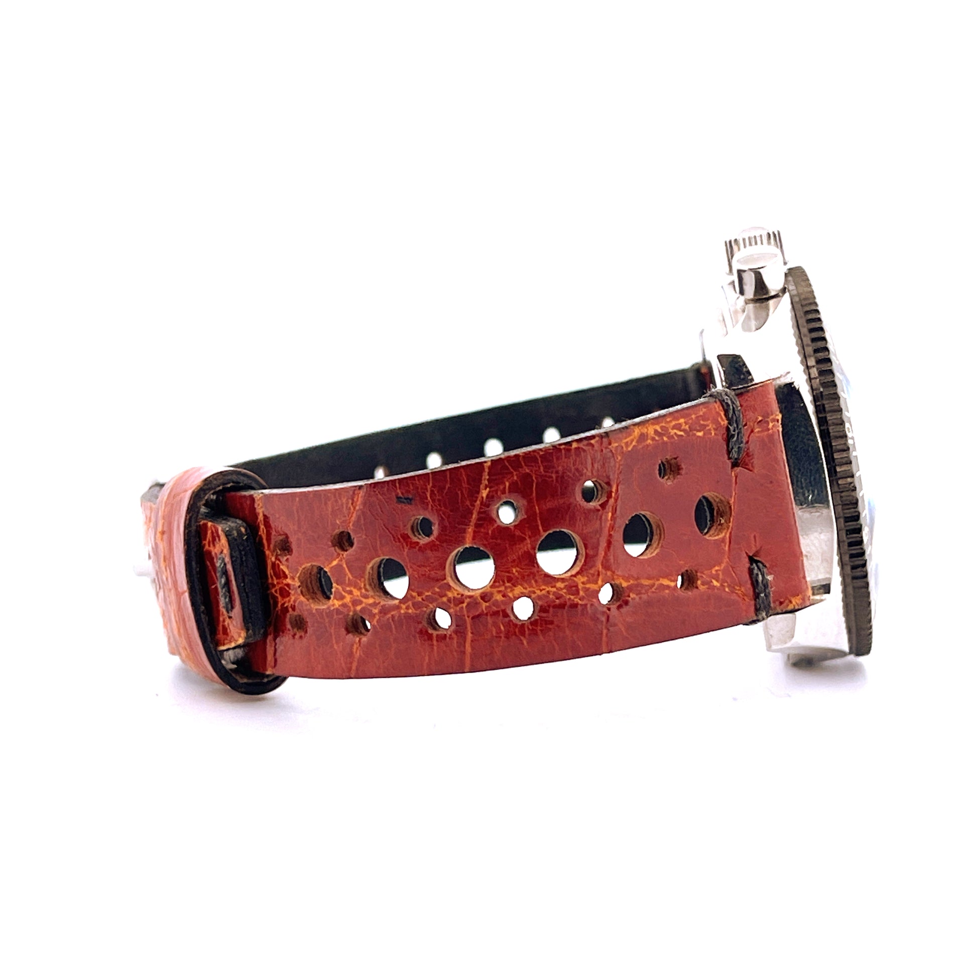 Das 38-mm-Stahlgehäuse fängt mit seiner zweifarbigen Lünette und präzisen Minutenmarkierungen den essenziellen Charme vintage-inspirierter Instrumente ein. Das tiefschwarze Zifferblatt bildet einen markanten Kontrast zu den hellen Totalisatoren, während applizierte Stundenindizes und zentrale Zeiger mit Leuchtmasse für optimale Lesbarkeit sorgen – selbst in gedimmtem Licht. Der zentrale Sekundenzeiger unterstreicht die dynamische Funktionalität. Ergänzt wird dies durch ein braunes perforiertes Rindslederarmband mit Dornschließe, das eine warme, sportliche Note hinzufügt und höchsten Tragekomfort gewährleistet.